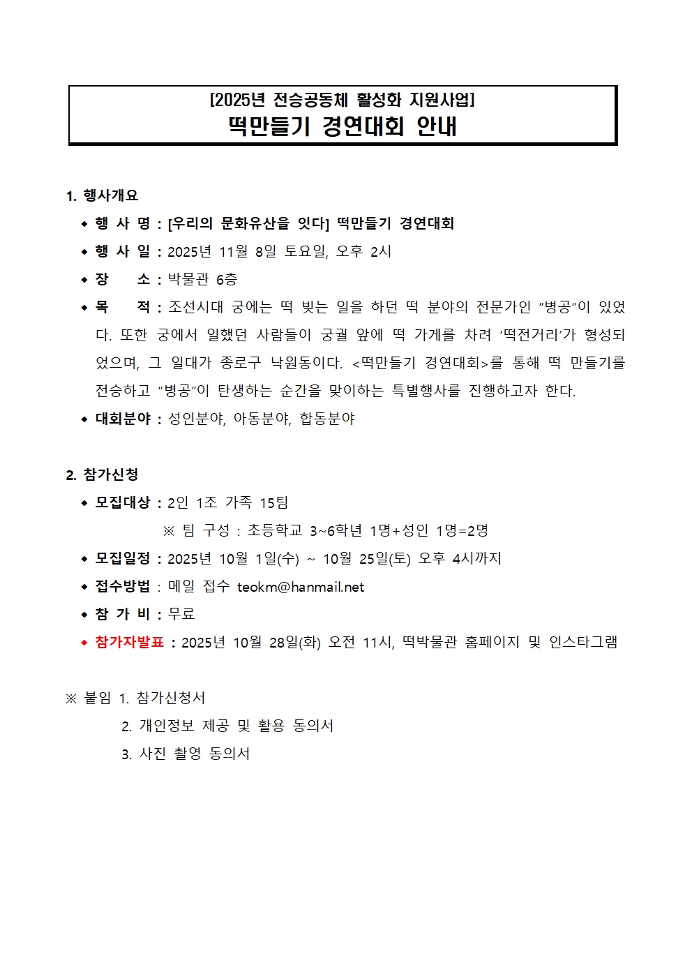 떡만들기 경연대회 참가 신청 안내 (2025 전승공동체 활성화 지원사업)