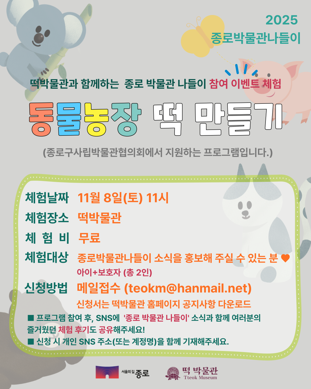2025 종로 박물관 나들이 참여 이벤트 체험 <동물농장 떡 만들기> 안내