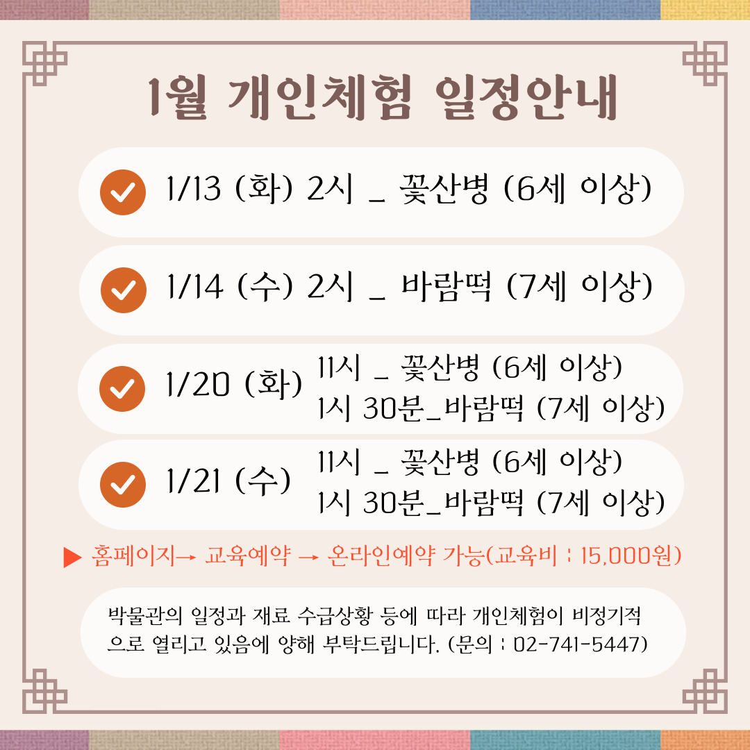1월~2월 개인체험은 박물관의 일정과 재료 수급상황에 따라 비정기적으로 운영됩니다.
