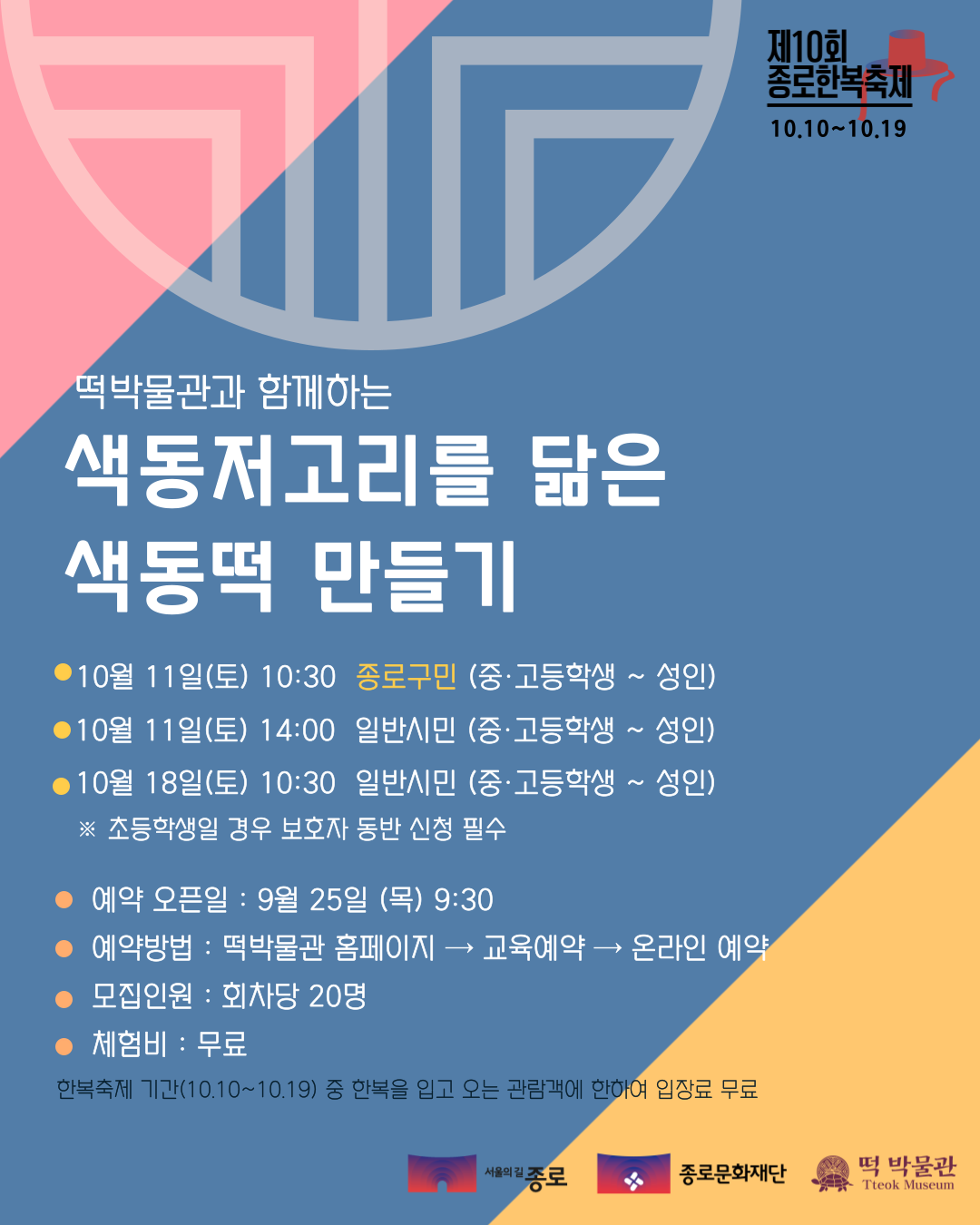 ※ 10월 11일(토) 10:30 체험은 종로구민만 신청하실 수 있습니다.  신청 시, 동 기재 필수
